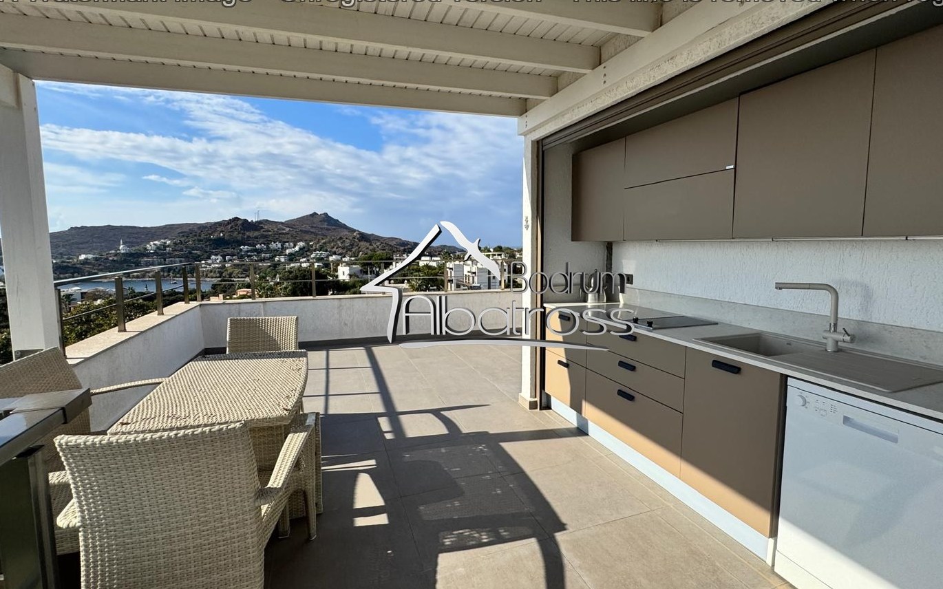 **A kitchenette is also included on the terrace. The unique panoramic views of Yalıkavak and the sea offer a brilliant view, even in the evenings.